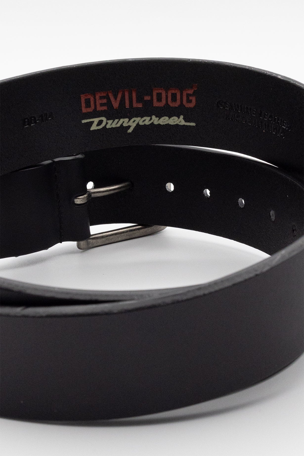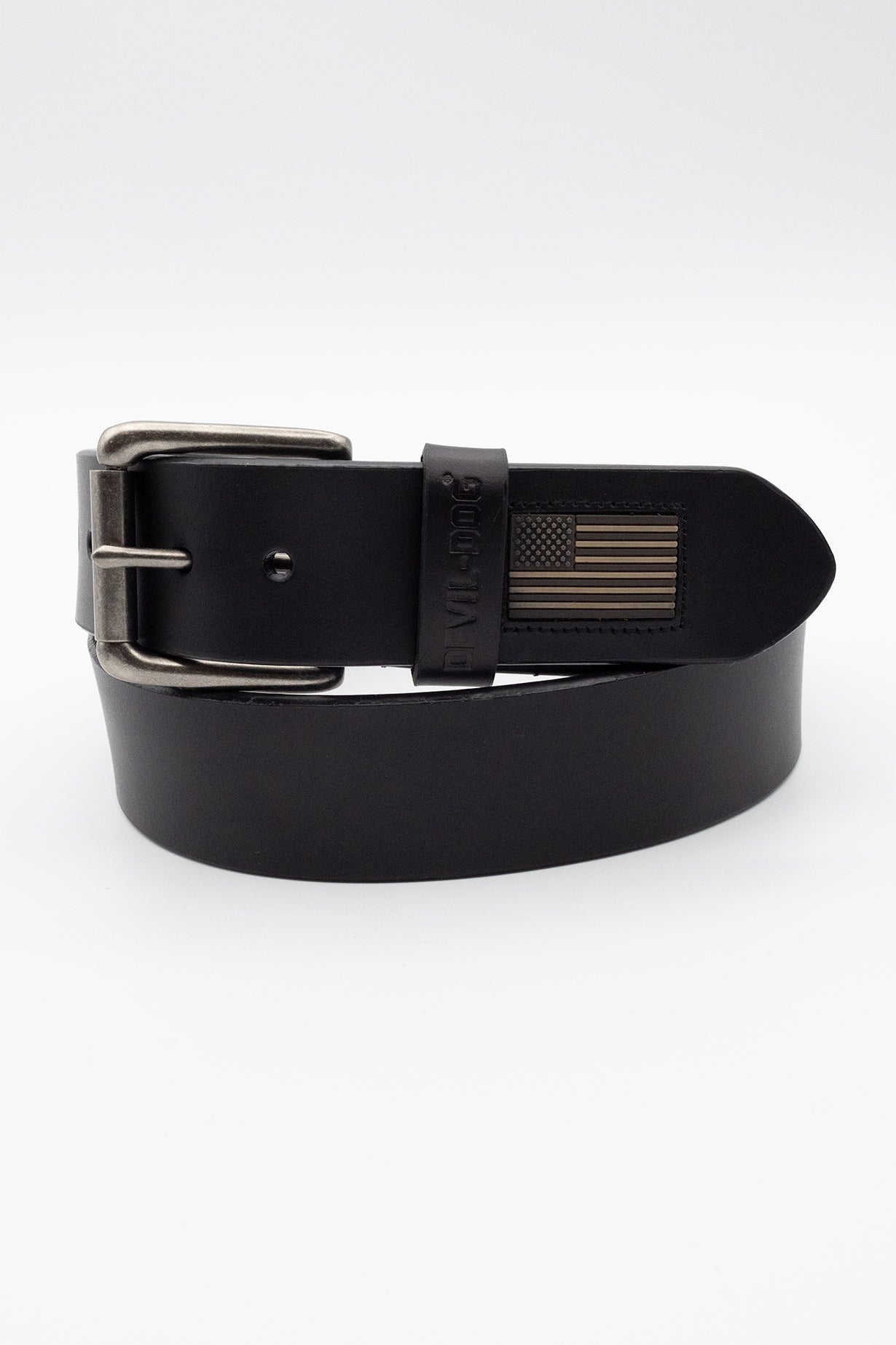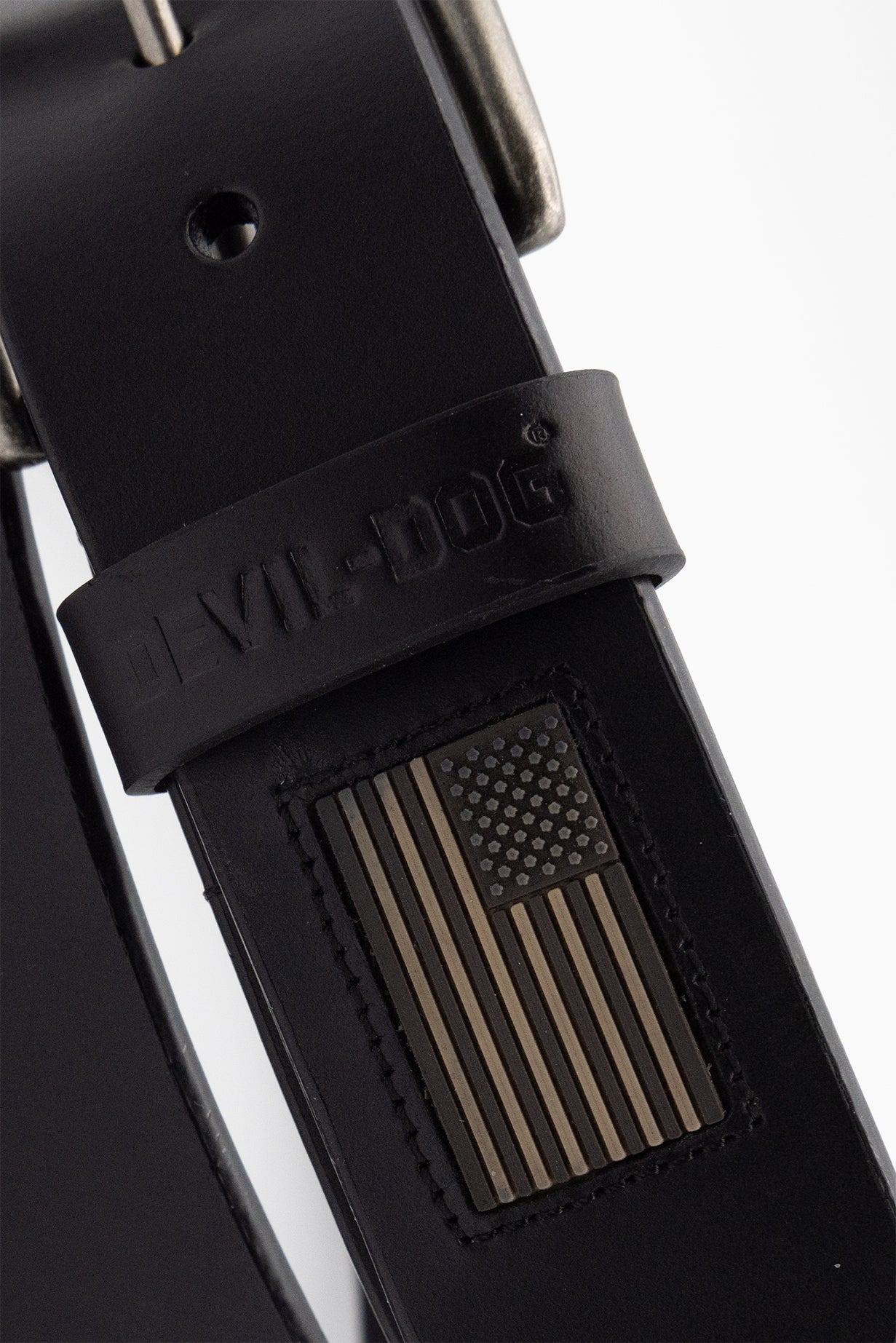 Denim defines American culture, so complete the look with this genuine leather belt appropriately tipped with a flag emblem patch. Designed for durability and everyday wear, it’s finished with a sturdy roller buckle and an embossed DEVIL-DOG® logo on the keeper—making it the perfect accessory to pair with your favorite dungarees.