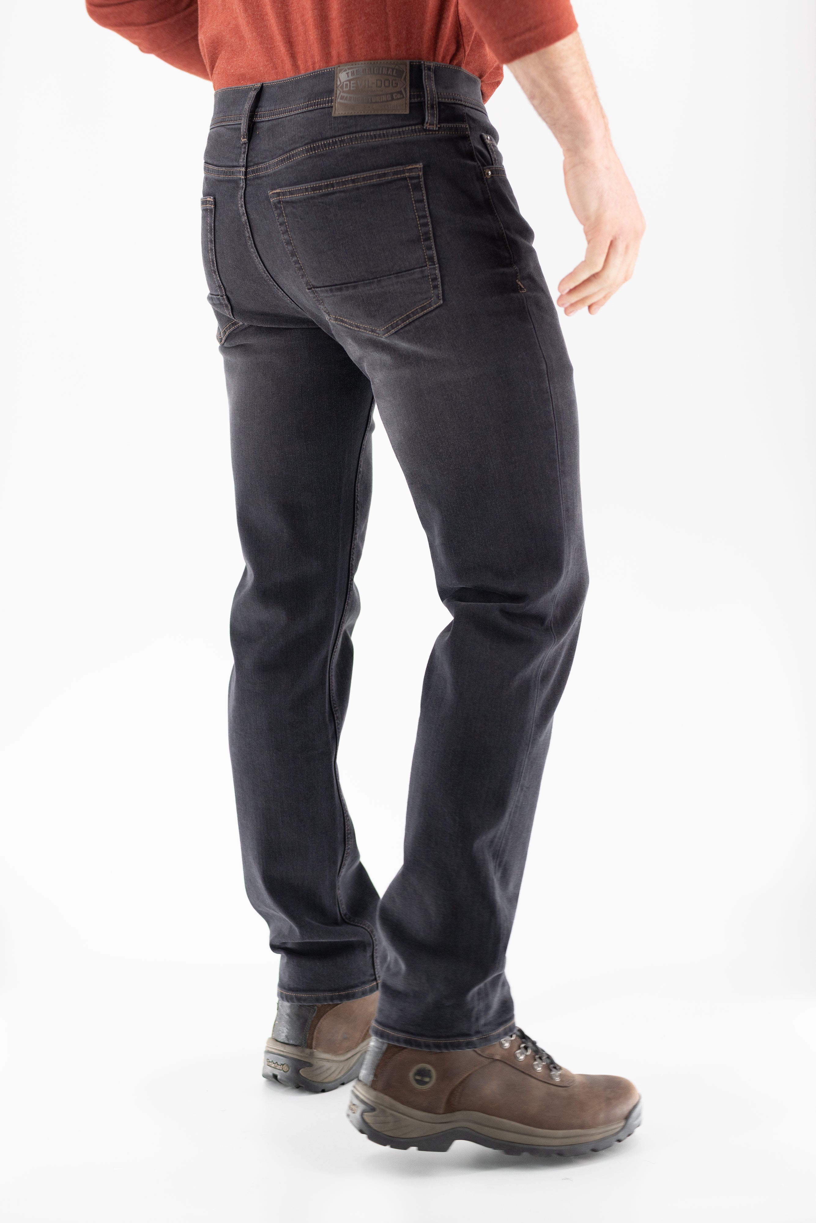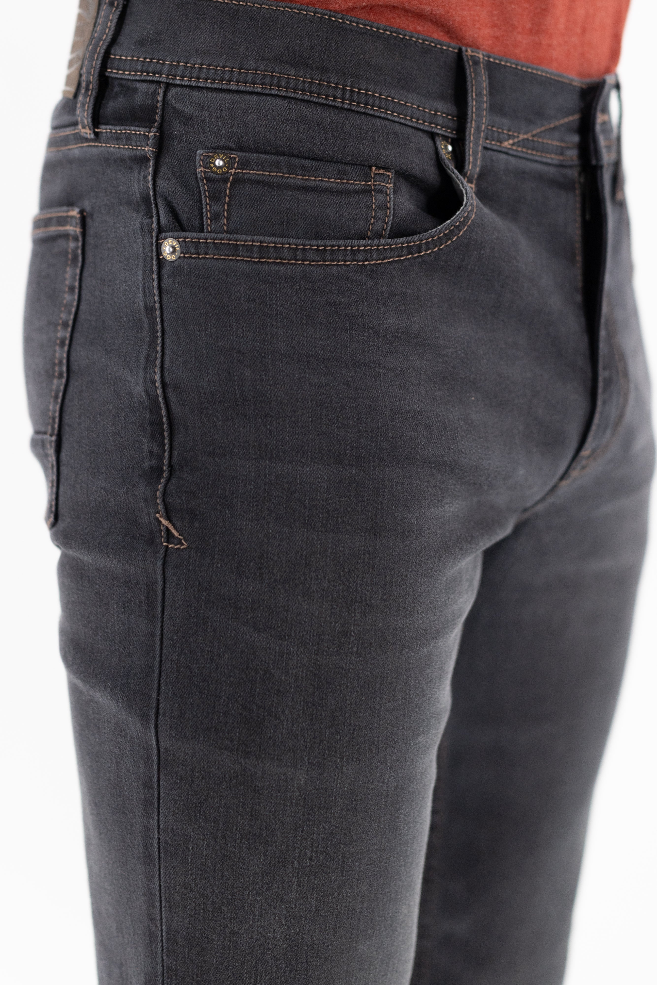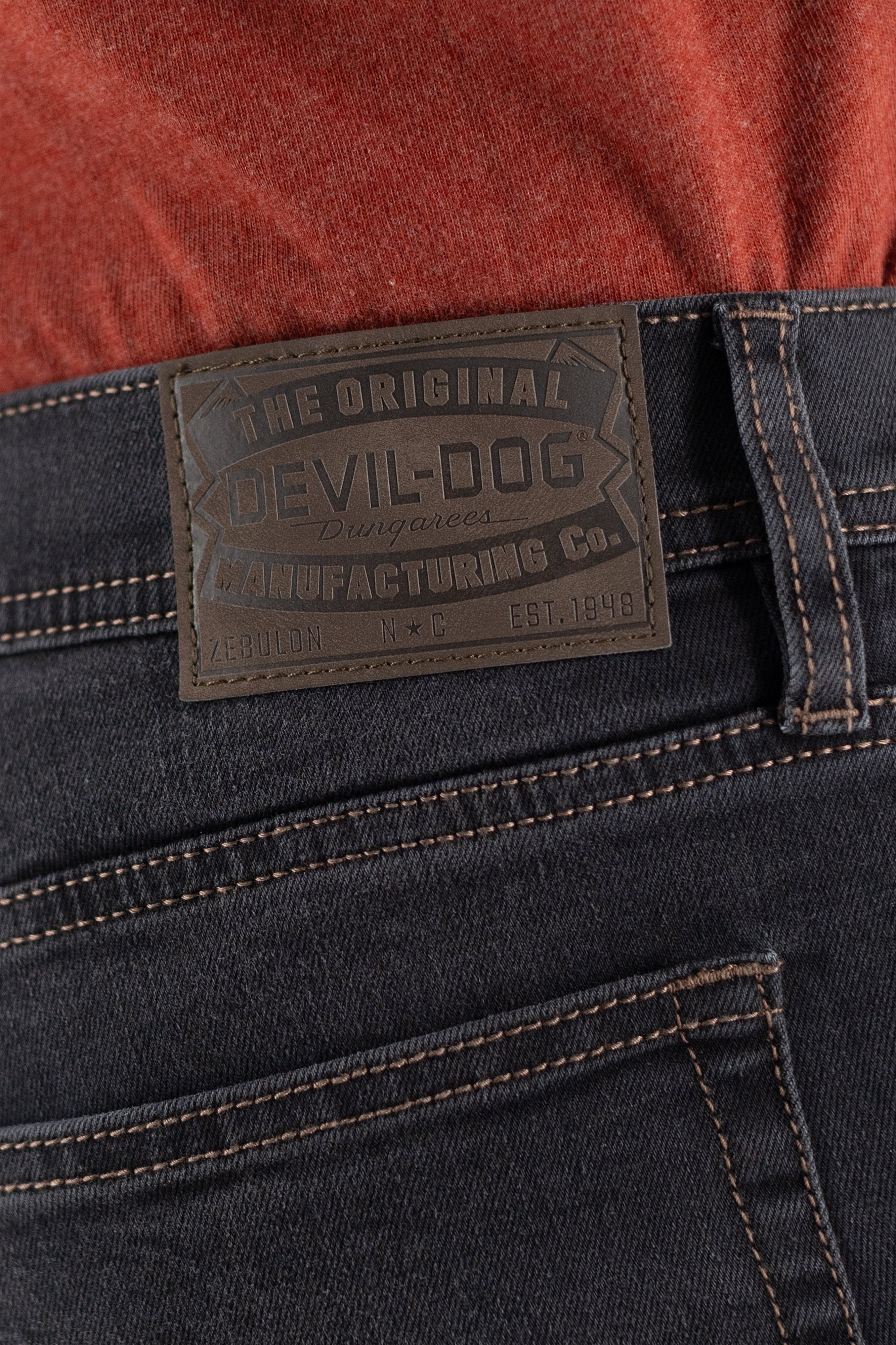 • Five pocket construction.  Zip fly.