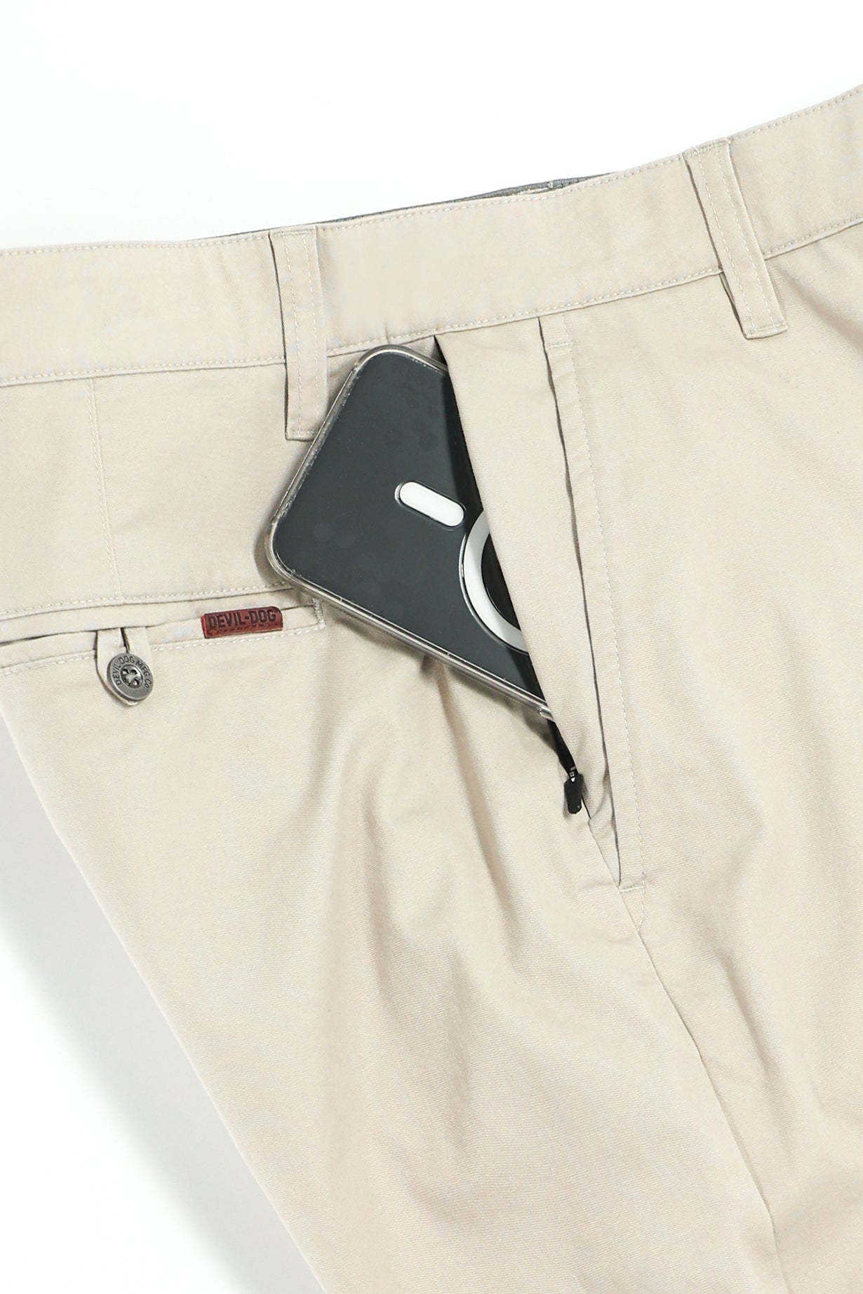 - Rubber tipped zipper heads and front button.