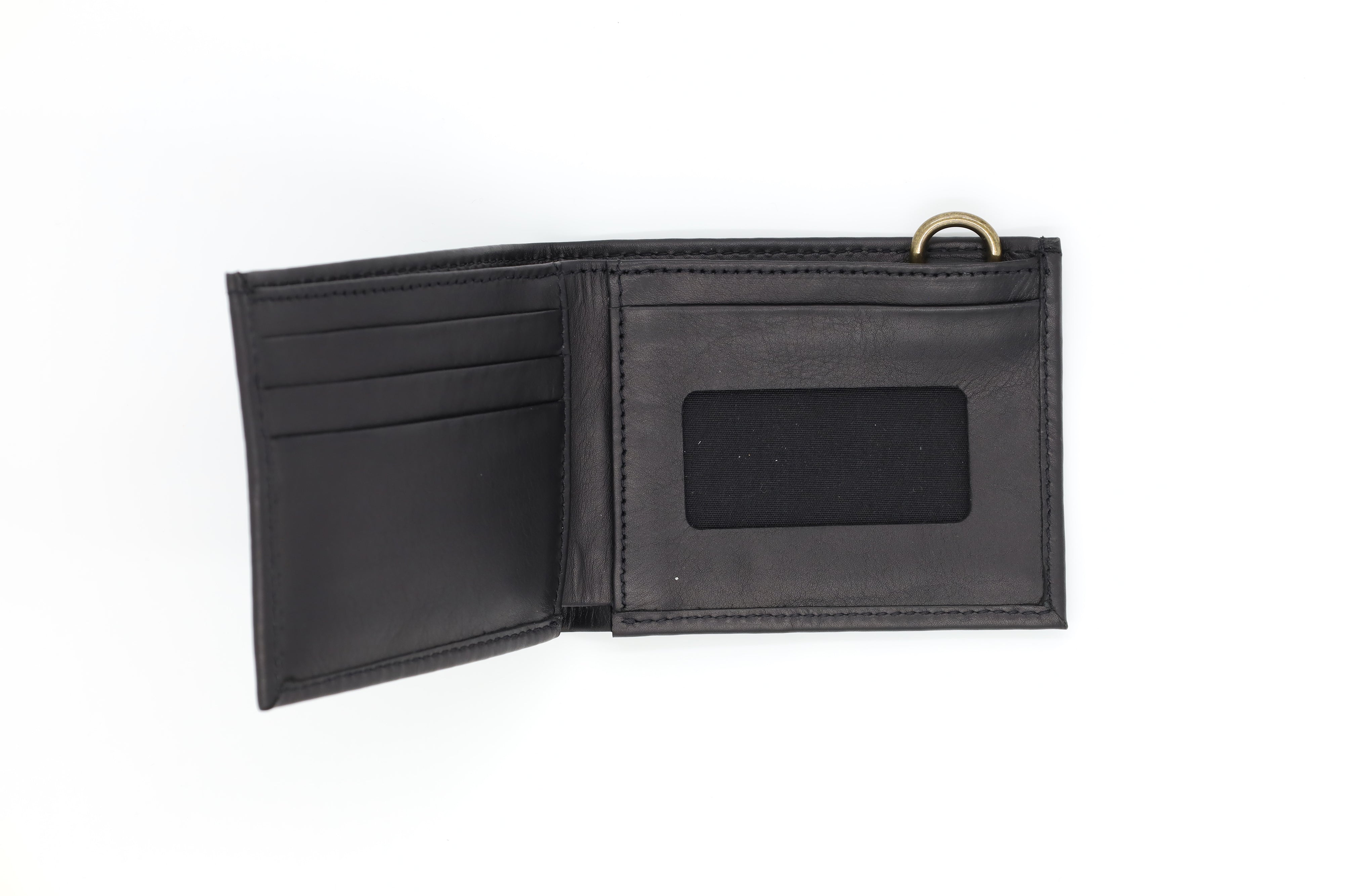 Our slim Bi-Fold wallet keeps all of the essentials at your fingertips. Made of genuine leather, this wallet includes a D-ring to attach the matching FOB and chain for extra security.