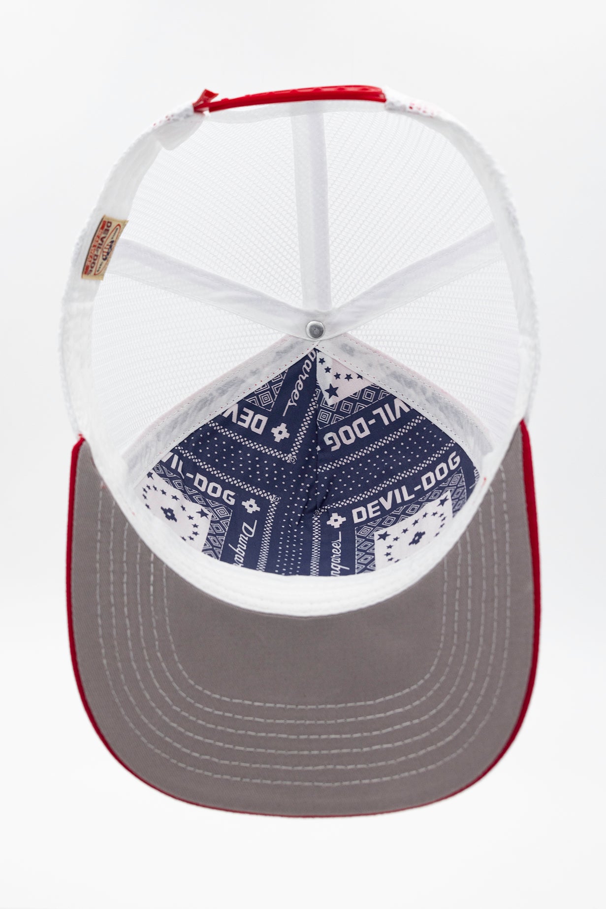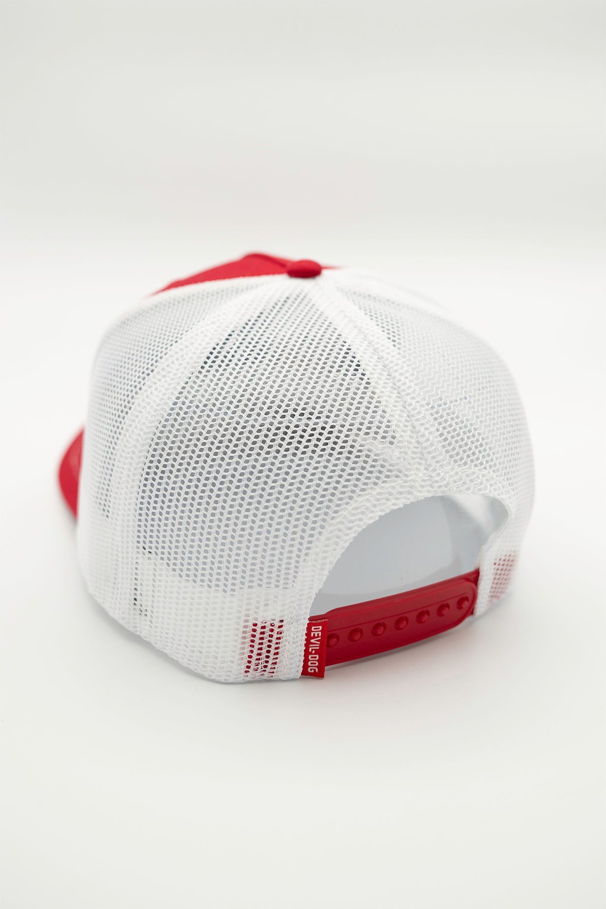 The Americana trucker hat, featuring a nostalgic garage station patch, is a nod to the good old days. Designed for comfort, it includes a sturdy mesh back, contrasting white topstitch on the bill, and a contrast underbill to reduce sun glare.