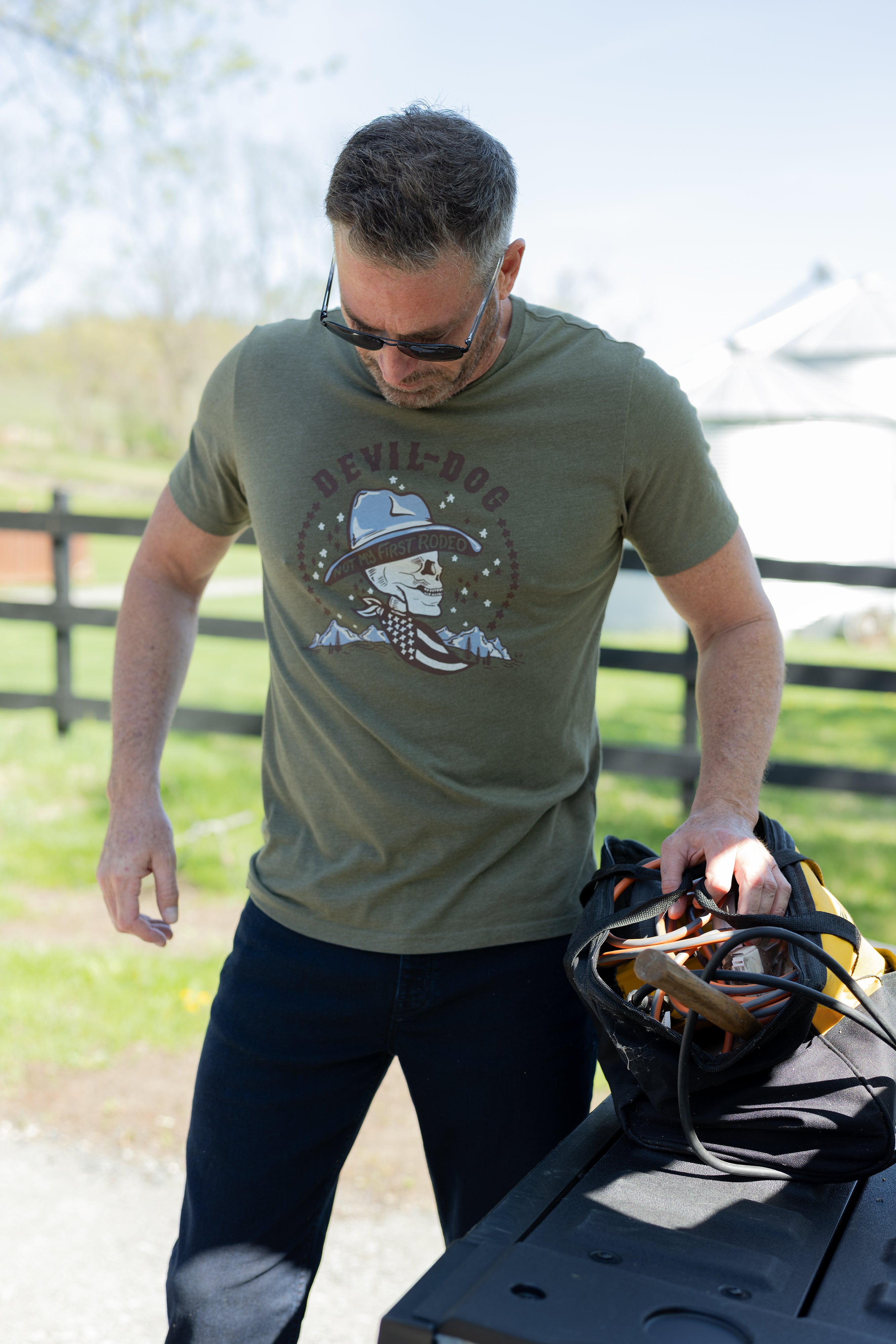 This ain’t your first rodeo—and it shows. Embrace that hard-earned grit with this bold DEVIL-DOG® graphic tee, featuring our skull cowboy riding through life like a pro. Made from ultra-soft cotton jersey, it’s got the comfort and breathability to keep up with you, wherever the day leads.