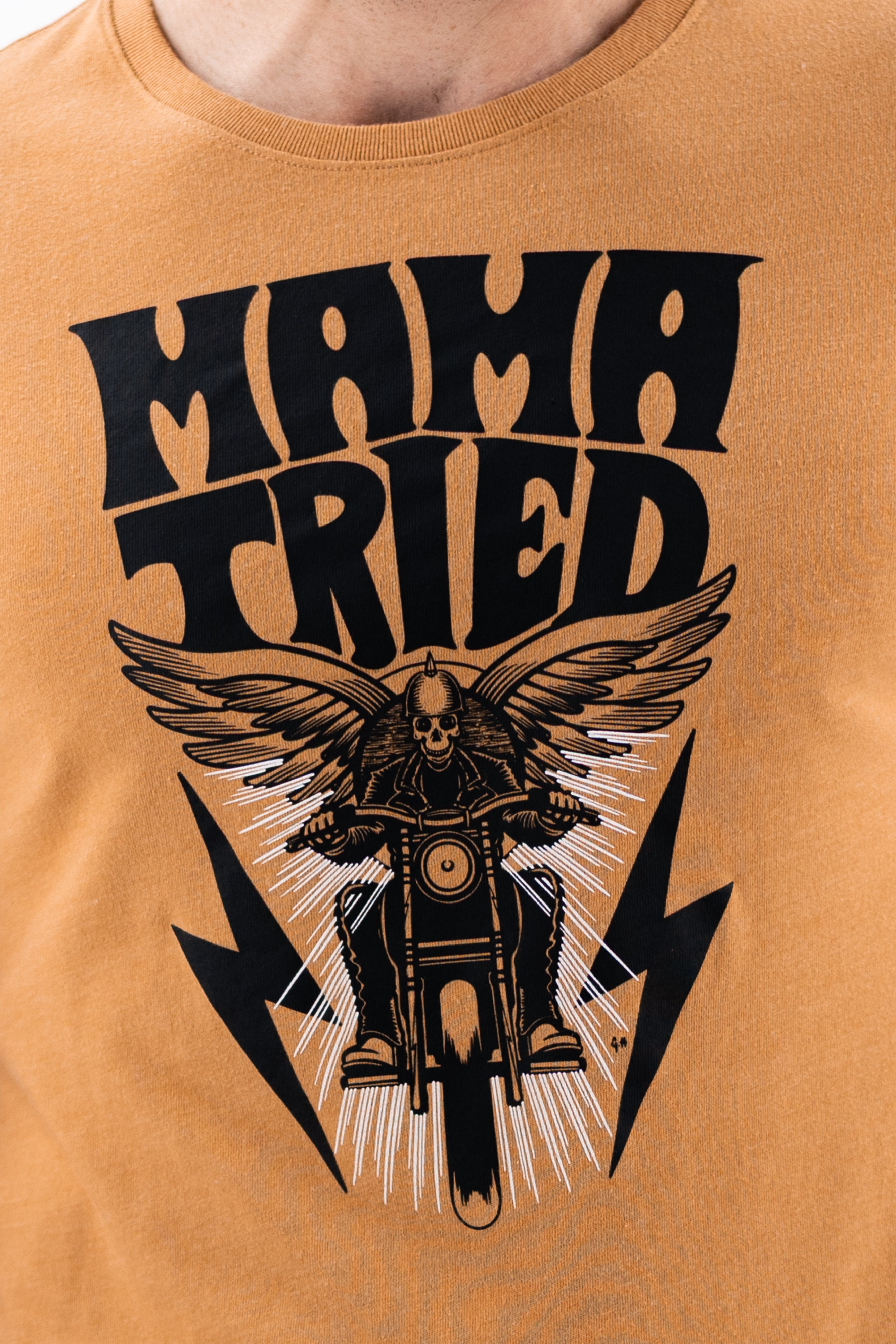Mama tried—so you might as well own it. This tee lets your rebellious streak fly with a nod to the ones who raised us and the roads that shaped us. Cut from ultra-soft cotton jersey, it’s built for comfort, breathability, and raising a little hell.