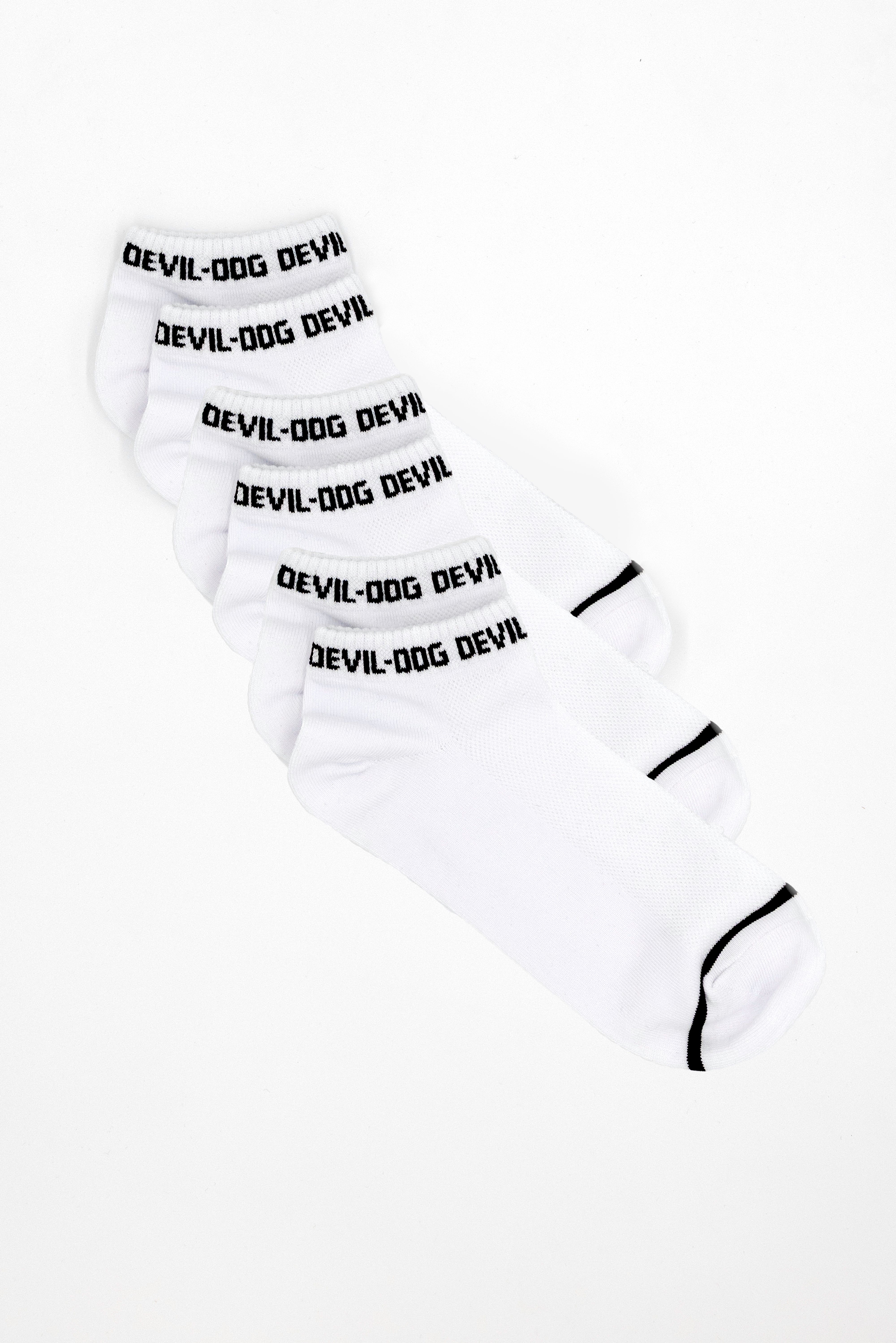 Go head to toe in DEVIL-DOG! These vintage inspired socks sit at calf height with a stretch rib knit upper and comfy contoured padded sole.