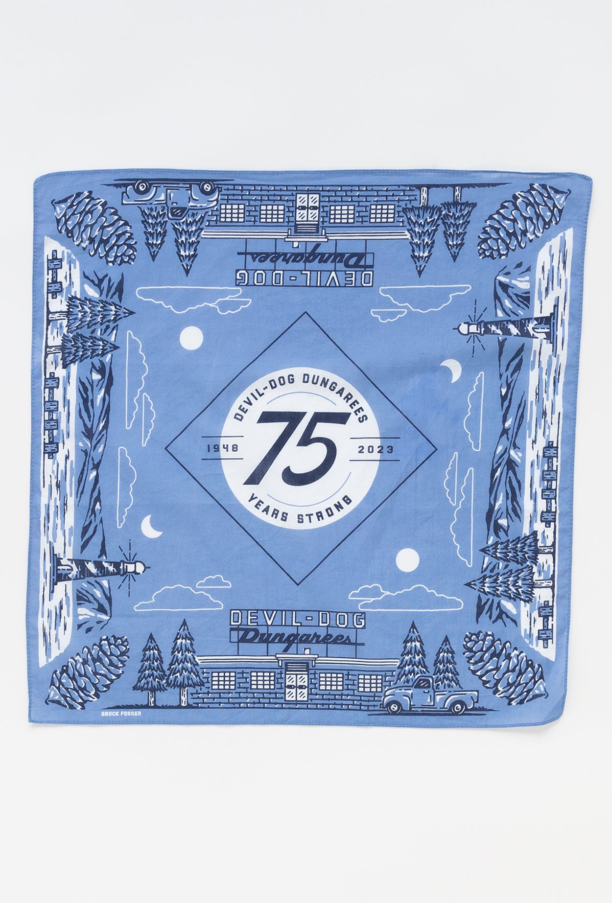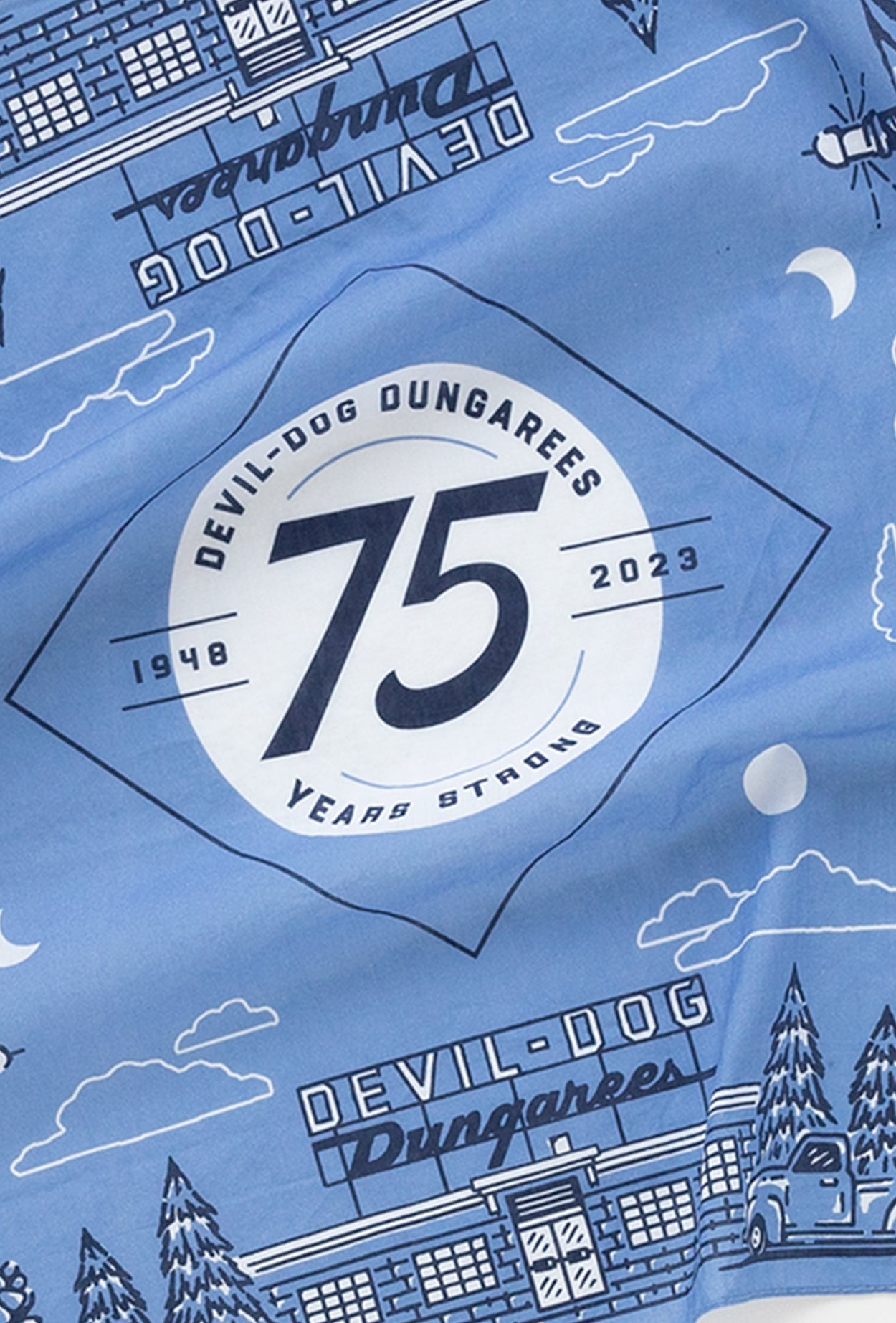 DEVIL-DOG® Dungarees celebrates 75 years strong with an original print bandana designed by Brock Forrer, a local graphic designer from North Carolina. As depicted in the artwork, visit in person to see our iconic 1950’s neon sign light up on top of our distribution center in Zebulon, NC outside Raleigh. Enjoy the trip!