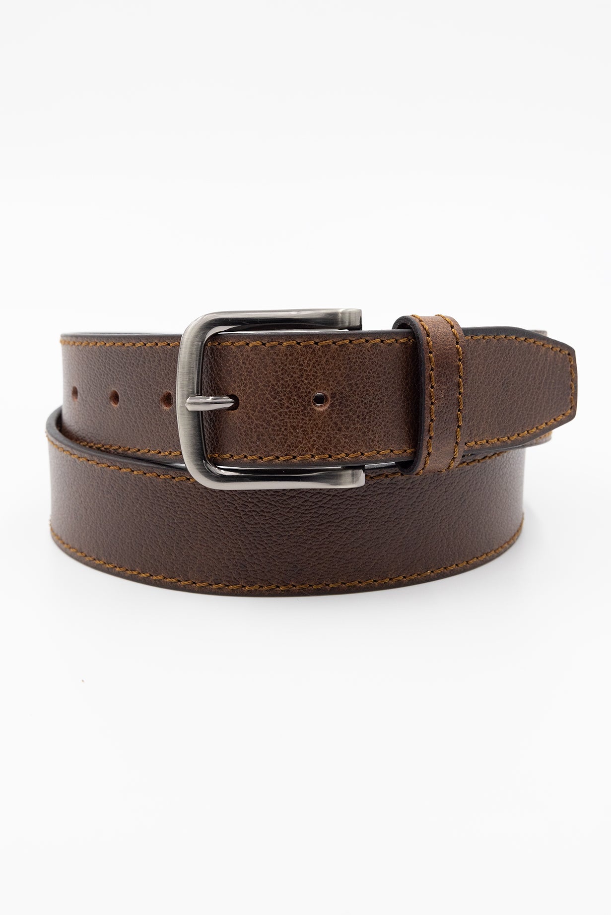 Crafted from genuine leather, this belt features a rich surface texture enhanced by tonal stitching for a subtle, sophisticated finish. The sleek nickel-finish buckle adds a polished touch, making it a versatile accessory that effortlessly complements both casual and dress looks.